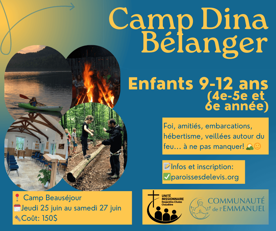 Camp d’été pour enfants de 4e, 5e et 6e années animé dans les grâces de la Communauté de l’Emmanuel. Le Camp bénéficie de l’accompagnement et des installations des Frères du Sacré-Coeur. Foi, amitiés, embarcations, hébertisme et veillées autour du feu au rendez-vous! Un maximum de 30 enfants peuvent s’inscrire. L’abbé Kevin Murray sera aumônier du Camp.